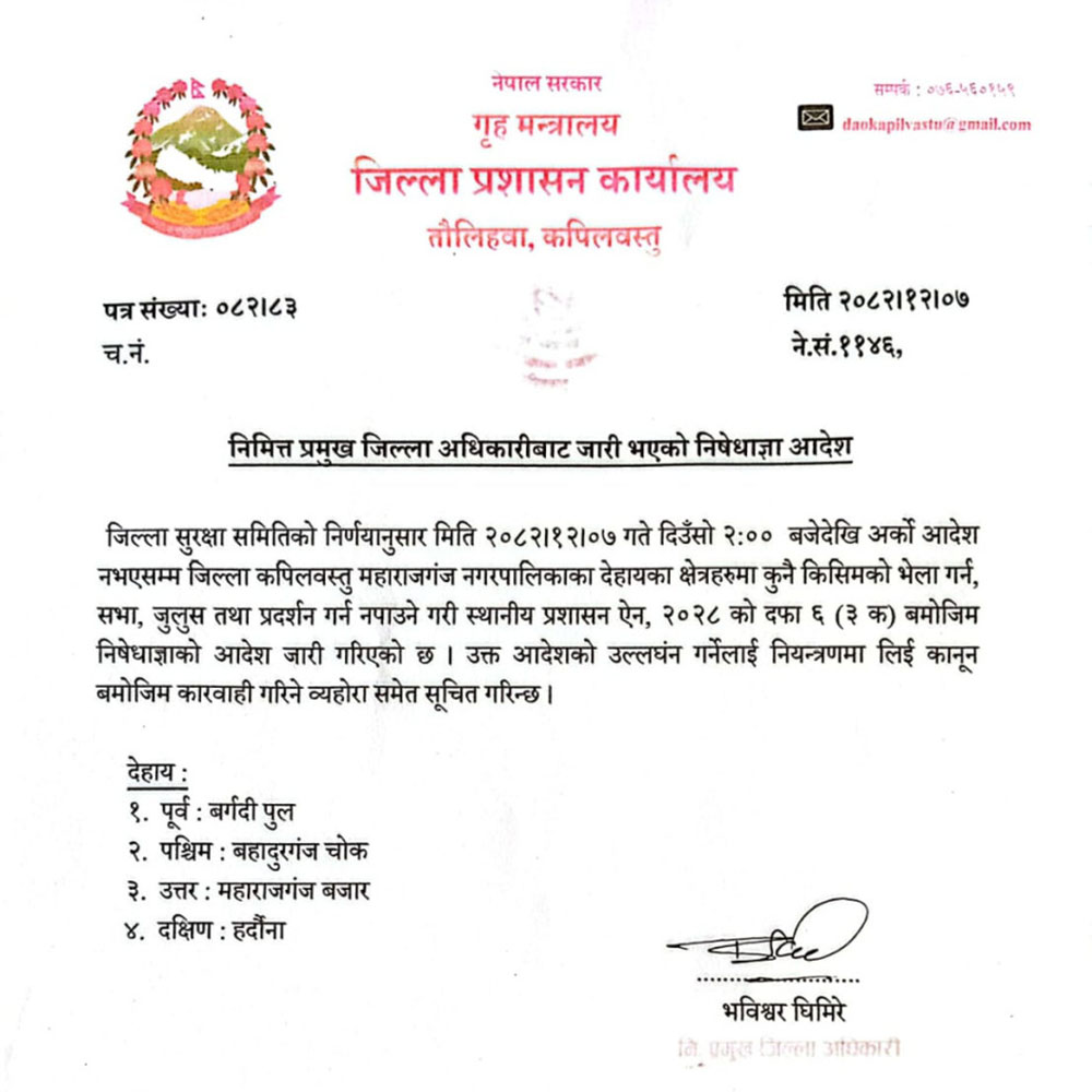 बुटवल । जिल्ला प्रशासन कार्यालय कपिलवस्तुले महाराजगंज क्षेत्रमा निषेधाज्ञा जारी गरेको छ ।